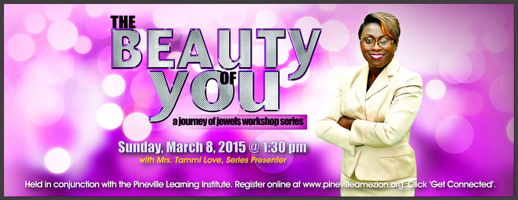 My writings over the past year have done something miraculous in my life. They have awakened something in me that I thought I had laid to rest years ago. God truly uses our journey to bless us and others, if we only allow it. I am truly humbled and count it a privilege to be used by God in any way. So after much prayer and counsel from God, I’ve said ‘yes’ to His call to go a little further from where He first took a hold of me. A place where He took the time to mold and shape me and stirred me to be who I am today, a daughter who desires to honor and please her Heavenly Father. The development of The Beauty of You Workshop Series was birthed from my journey of surrender. I am so grateful to God to hear the positive feedback from my Blog readers and to be a part of someone else’s transforming journey! I pray that if you are able and available that you will attend the first workshop in March. It’s free! I encourage you to share the announcement with your family and friends. And without question, I ask that you join me in covering this God-work in the powerful, delivering, transforming blood of Jesus! May God continue to bless you, amazingly!! The workshop is held in conjunction with Pineville AME Zion Church’s Learning Institute. The workshop description is below.