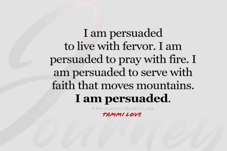 I am persuaded to live with fervor. I am persuaded to pray with fire. I am persuaded to serve with faith that moves mountains. I am persuaded. The life God has given me persuades me to be an example that points the lost, the broken, the forgotten, the cast aside – to Him. To Him, who saves me from myself. To Him, who is mighty in ALL things. To Him, who is Alpha and Omega. To Him, who bids us all to draw near to Him and find rest. Are you persuaded to begin a renewed walk with God? I invite you to do so today.