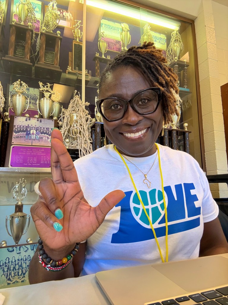 (Pictured: Dr. Tammi Love welcomes 1Love Basketball campers at the check-in table with the signature 1Love gesture.)