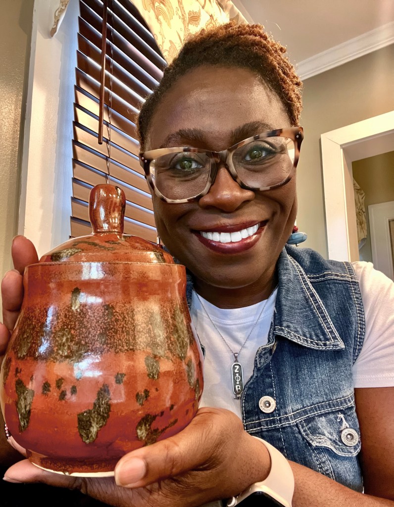 Days passed, and so did my recollection of her anticipated visit. Until, of course, one Sunday morning, I drove into our church parking lot and saw an unfamiliar car. I was rushing to get inside for Sunday School, and Ms. Mary got out of her car to warmly greet me. She then presented me with a gift bag. She said, “I told you I was coming.” I instantly remembered our conversation after that worship service. I put aside the things I had in my hands and carefully opened the gift bag. As I removed the surrounding paper, the gift was revealed. The gift was a custom-made pot with beautiful curves and designs adorned with a matching lid fashioning a slight bend. As tears began to flow down my face, Ms. Mary said this was the pot God led her to for me. Ms. Mary’s ministry of pots is dependent on the direction of God. She sculpts them, and God instructs her on who to bless. She embraced me as I wept. I was overwhelmed by her kindness, by God’s mindfulness of me, and by a wound within that was being healed precisely at that moment.