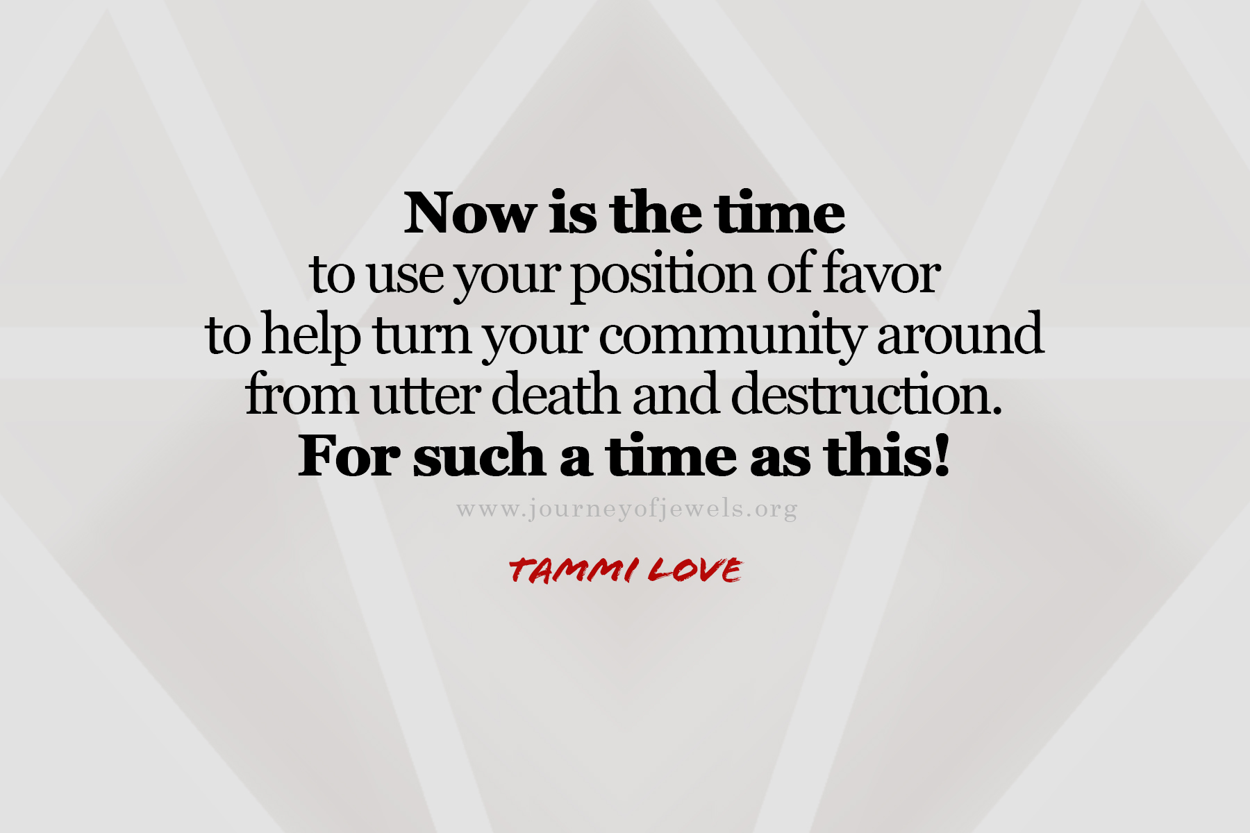 We must commit to this fight because God is declaring Now is the Time! Now is the time to use what God has already poured into us. Now is the time to use our position of favor to help turn our communities around, our world around – from utter death and destruction. For such a time as this!